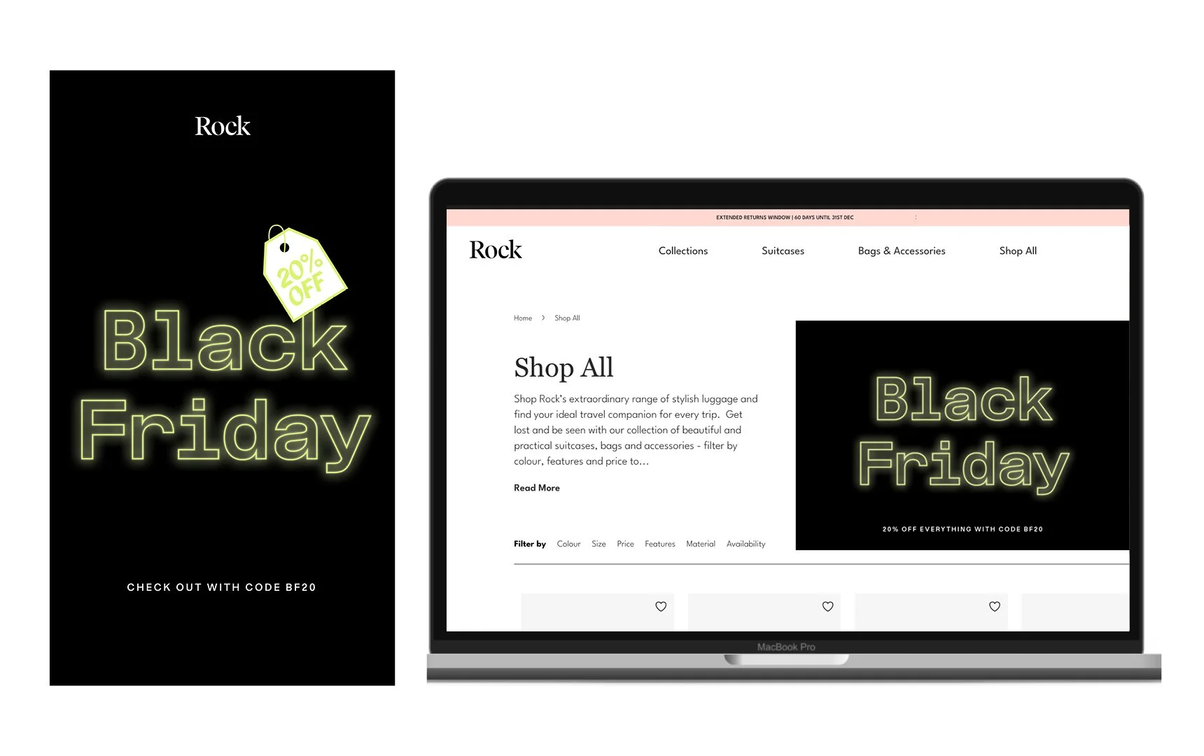 Rock has a fun, playful yet stylish aesthetic that appeals to a younger demographic. I worked across a range of deliverables for Rock Luggage, from the Black Friday logo and social assets to a printed lookbook, ensuring a cohesive and on-brand visual approach.